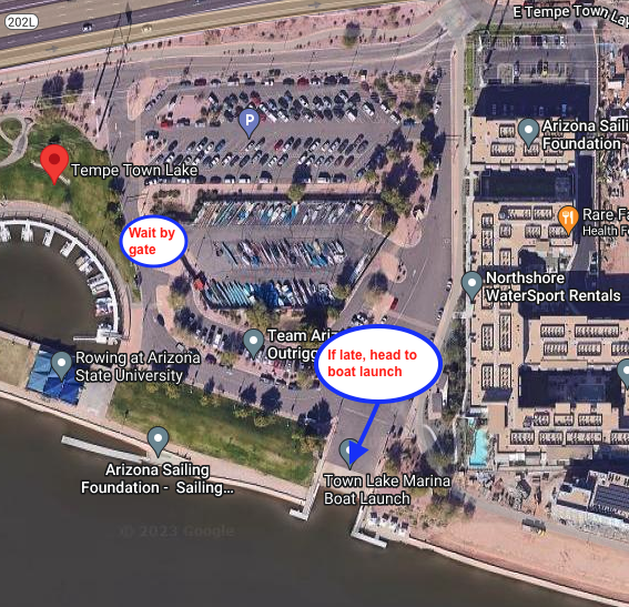We practice at the Tempe Town Lake Marina, Tempe, AZ. There should be plenty of parking spaces in the area. Once you’ve arrived, head to the gate where a coach or captain will wait for you. If you’ve arrived after the scheduled start time, the boat may already be by the boat launch (see image below) in which case you’ll head over there to find the team.